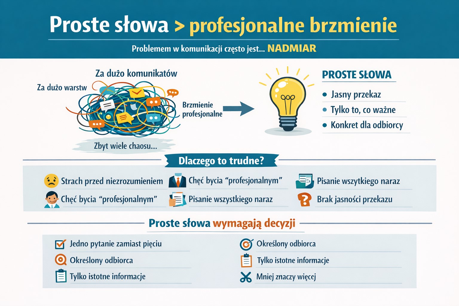W pracy z tekstami, mailami i stronami internetowymi bardzo często widzę ten sam mechanizm. Ktoś ma coś sensownego do przekazania, ale po drodze dokłada kolejne wyjaśnienia, zabezpieczenia i formułki. Efekt końcowy jest poprawny językowo, ale trudny do zrozumienia.
