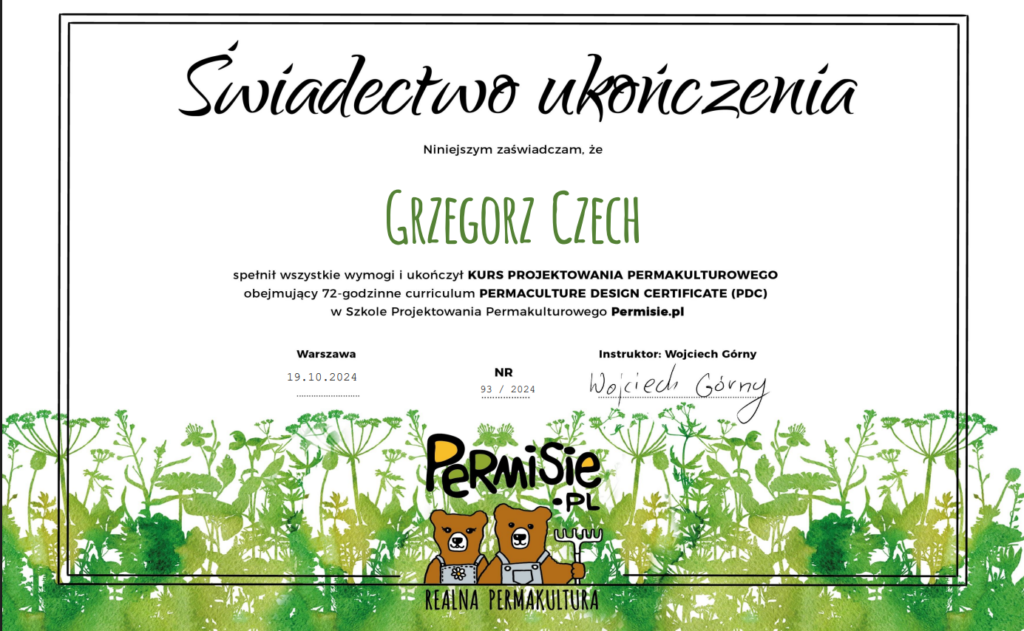 Jestem po certyfikowanym kursie projektowania permakulturowego (PDC), który dał mi solidne podstawy myślenia systemowego i projektowego. Traktuję go jednak jako punkt odniesienia, a nie zbiór sztywnych zasad. Najwięcej uczę się przez codzienną praktykę, obserwację i błędy.