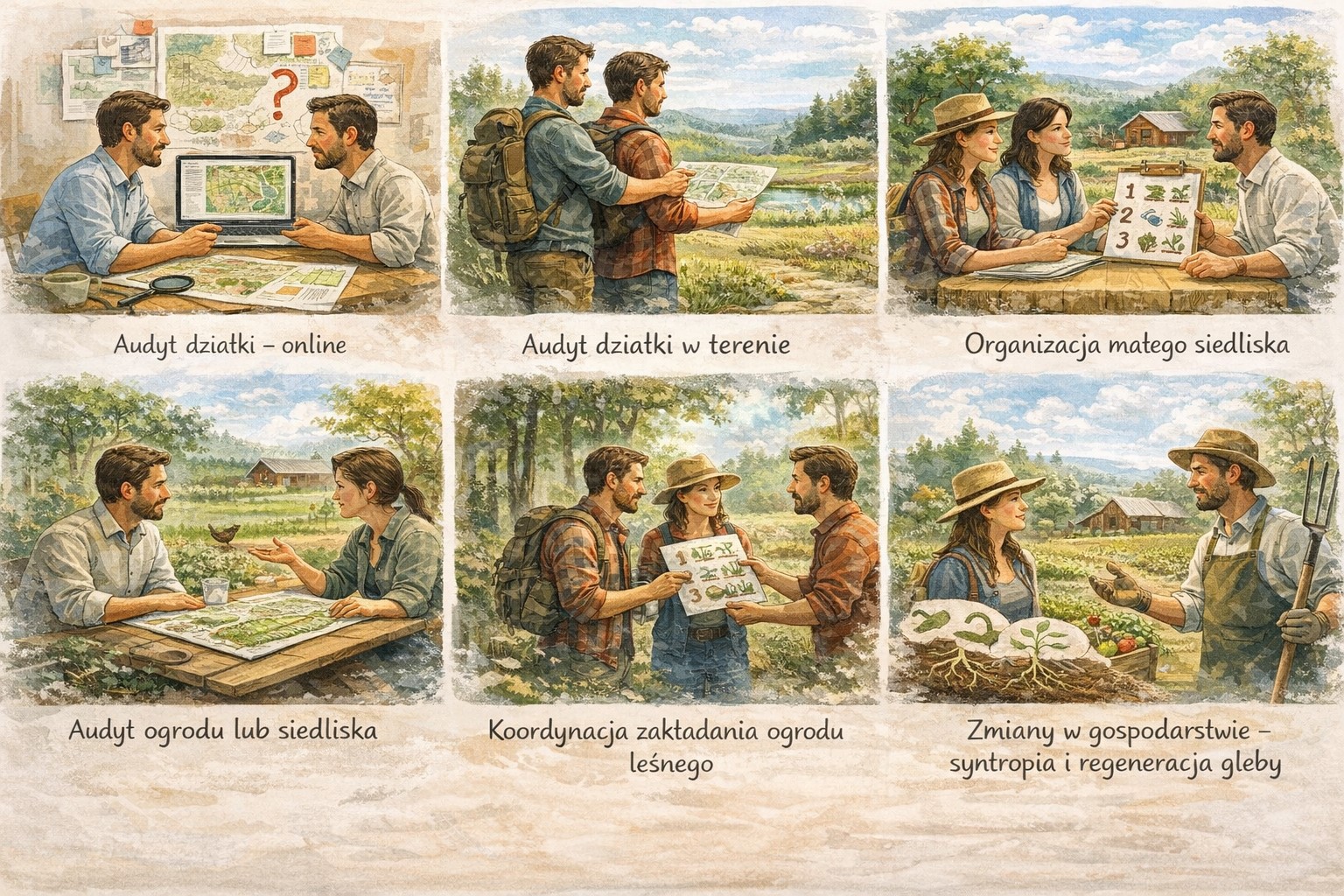 Analizuję istniejące gospodarstwo pod kątem przepływów energii, gleby, roślinności i organizacji przestrzeni. Pomagam wprowadzać elementy myślenia syntropijnego i regeneracyjnego w sposób etapowy, dostosowany do realiów miejsca i możliwości właściciela. Skupiam się na zmianach możliwych do wdrażania stopniowo, bez rewolucji i niszczenia tego, co już działa.